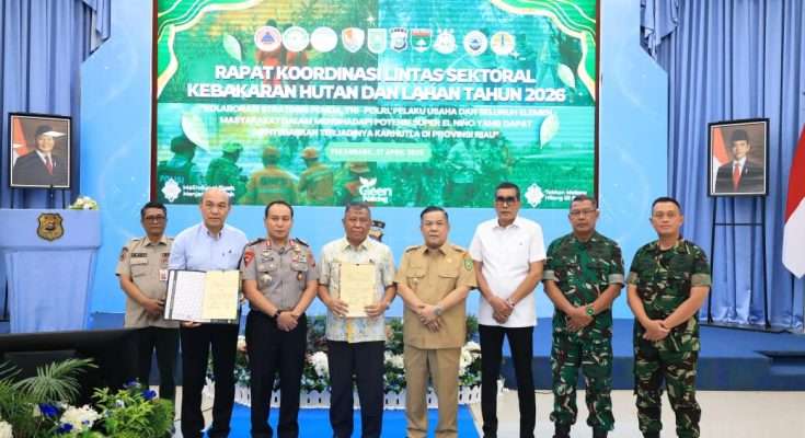 dutapublik.com, PEKANBARU – Polda Riau bersama Forum Koordinasi Pimpinan Daerah (Forkopimda) menggelar Rapat Koordinasi Lintas Sektoral Kebakaran Hutan dan Lahan (Karhutla) Tahun 2026 di Aula Tribrata Mapolda Riau, Senin (27/4/2026).