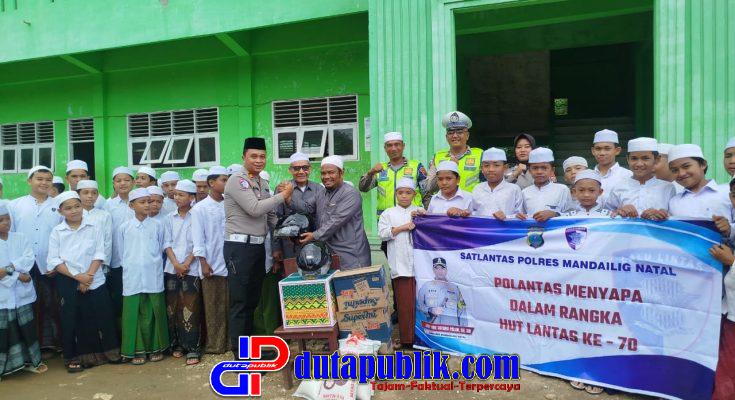 dutapublik.com, MADINA – Dalam rangka menyambut Hari Lalu Lintas Bhayangkara ke-70 tahun 2025, Satuan Lalu Lintas (Satlantas) Polres Mandailing Natal (Madina) menggelar kegiatan Polantas Menyapa bersama santri Pondok Pesantren Musthafawiyah, Desa Purba Baru, Kecamatan Lembah Sorik Marapi, Minggu (7/9/2025).