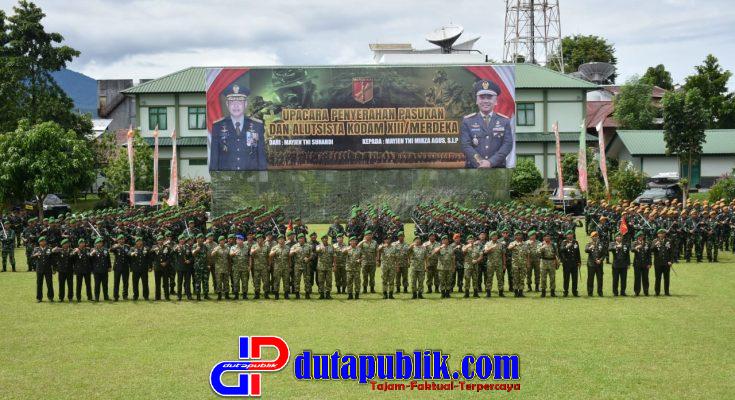 dutapublik.com, SULUT – Upacara Penyerahan Pasukan dalam rangka Serah Terima Jabatan (Sertijab) Panglima Komando Daerah Militer (Pangdam) XIII/Merdeka dari Mayjen TNI Suhardi kepada Pangdam XIII/Merdeka yang baru, Mayjen TNI Mirza Agus, S.I.P., berlangsung khidmat di Lapangan Makodam XIII/Merdeka, Manado, Sabtu (13/12/2025). Kegiatan ini merupakan bagian dari rangkaian tradisi satuan Kodam XIII/Merdeka.
