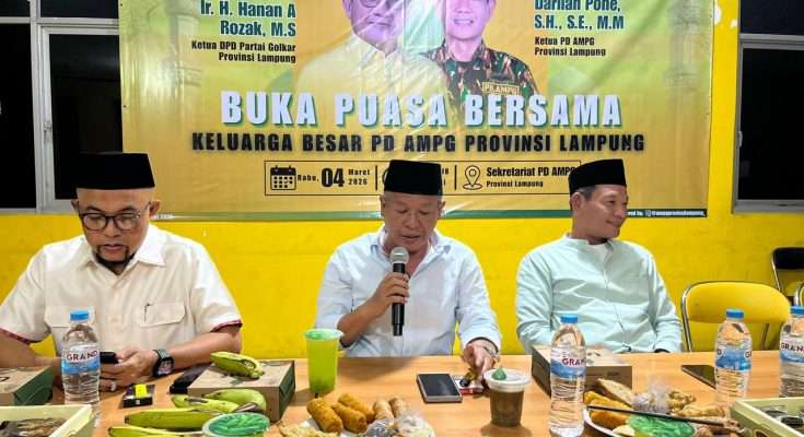 dutapublik.com, BANDAR LAMPUNG – Pimpinan Daerah (PD) Angkatan Muda Partai Golkar (AMPG) Provinsi Lampung menggelar kegiatan buka puasa bersama di Sekretariat PD AMPG Provinsi Lampung, Rabu (4/3/2026). Kegiatan ini bertujuan untuk mempererat silaturahmi sekaligus memperkuat konsolidasi organisasi di bulan suci Ramadan 1447 Hijriah.
